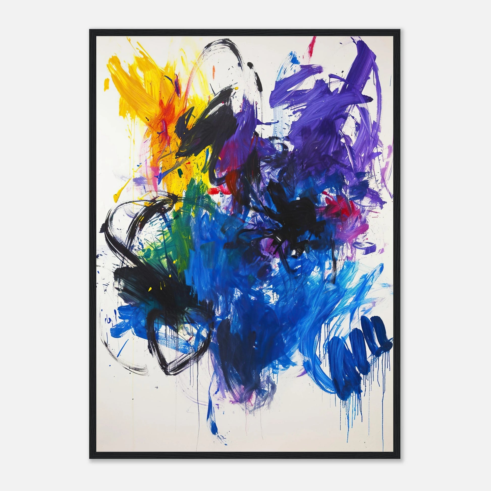 Eine kraftvolle Komposition aus wilden, dynamischen Pinselstrichen in intensiven Farben. Das Bild ist geprägt von leuchtenden Blau-, Lila-, Rot- und Gelbtönen, die in einem scheinbar chaotischen, aber energetischen Muster über die Leinwand verteilt sind. Schwarze Linien und Farbflecken durchbrechen die bunten Flächen und verleihen dem Werk eine zusätzliche Tiefe und Bewegung. Die expressive Malweise erinnert an den abstrakten Expressionismus und vermittelt eine starke emotionale Intensität, als wäre die Farbe direkt aus der Bewegung des Künstlers entstanden.